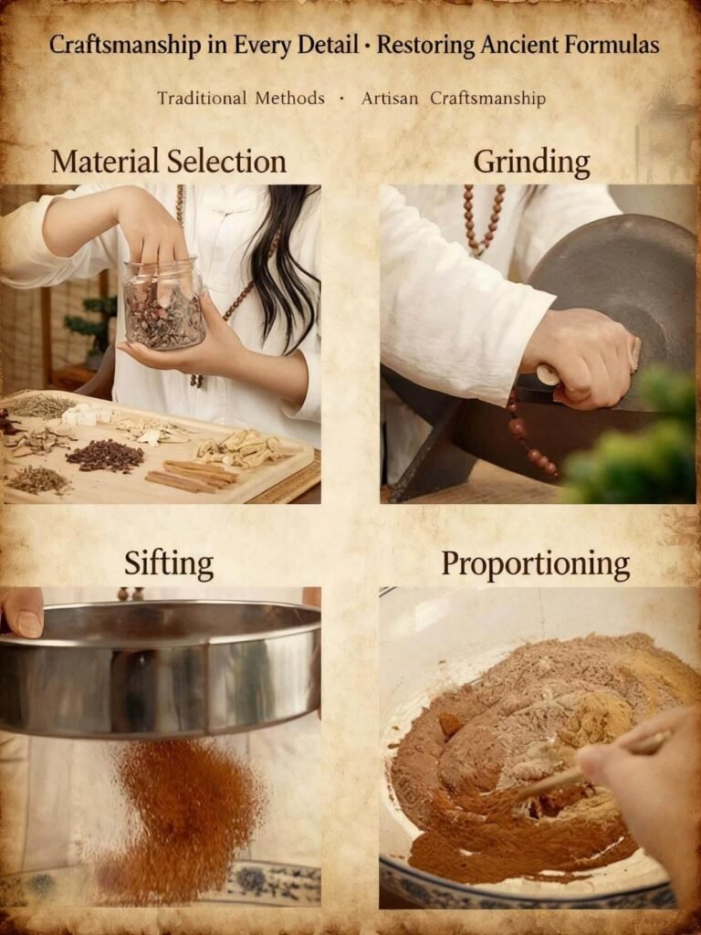 Its formula is sourced from an ancient recipe in “Qian Jin Yao Fang” by Sun Simiao. Common components include natural fragrant substances such as lavender, sandalwood, agarwood, Poria cocos, Polygala tenuifolia, and Caulis Polygoni Multiflori. These ingredients can soothe emotions and aid in promoting sleep.